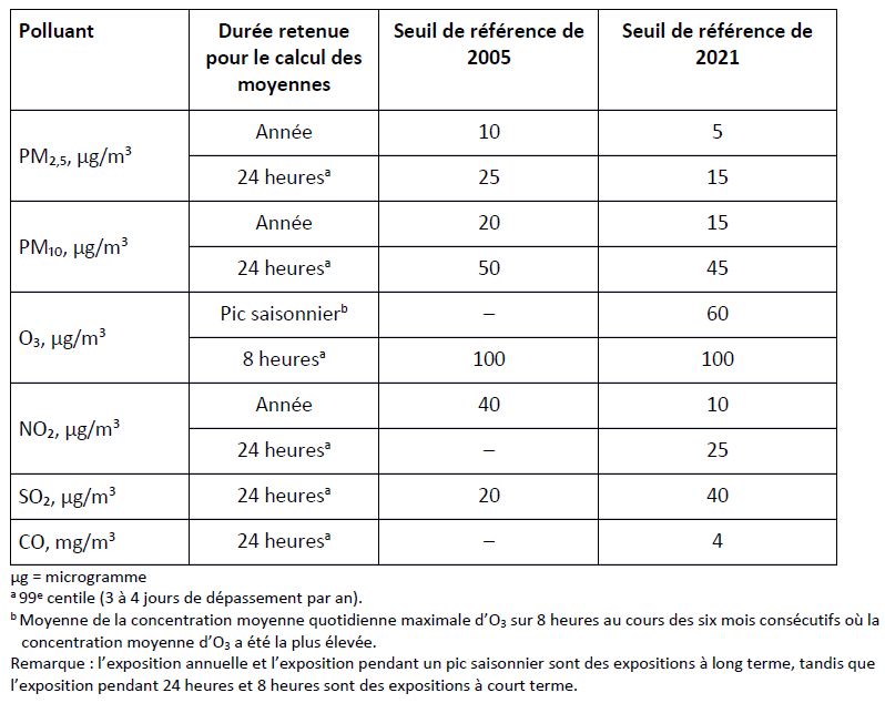 L’organisation a abaissé la quasi-totalité de ses seuils qui portent sur six polluants, dont certains contribuent également aux changements climatiques : les particules fines PM2,5 et PM10, l’ozone, le dioxyde d’azote, le dioxyde de soufre et le monoxyde de carbone. Ainsi, l’OMS divise par deux le seuil annuel recommandé pour les PM2,5, qui passe de 10 à 5 µg/m³. En parallèle, elle divise par quatre le seuil annuel pour le dioxyde d’azote qui passe de 40 à 10 µg/m³.