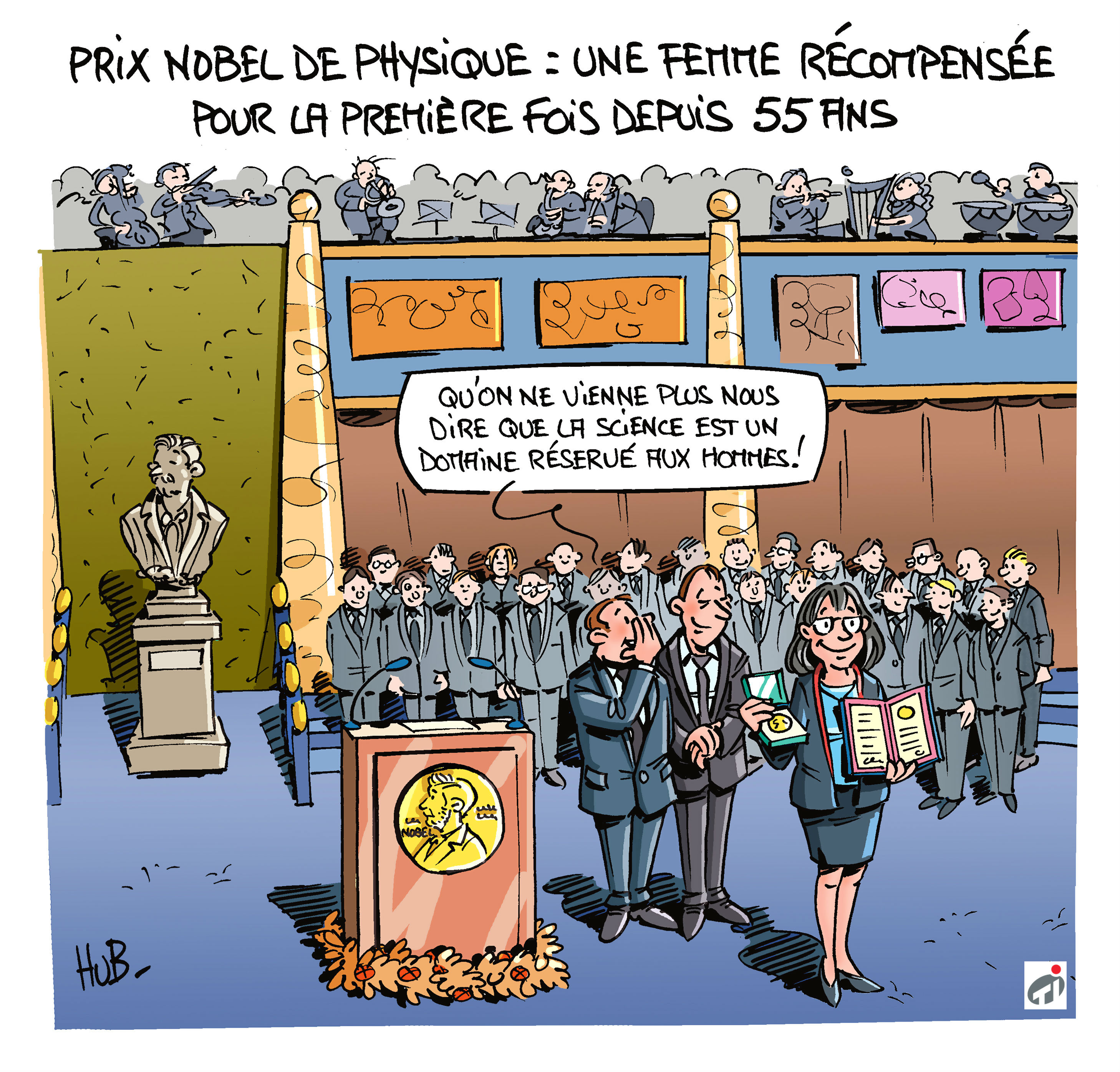 Chaque mois, Hubert Blatz croque l'actualité scientifique. Ce mois-ci, hommage à Donna Strickland, première femme Prix Nobel de physique depuis 55 ans !