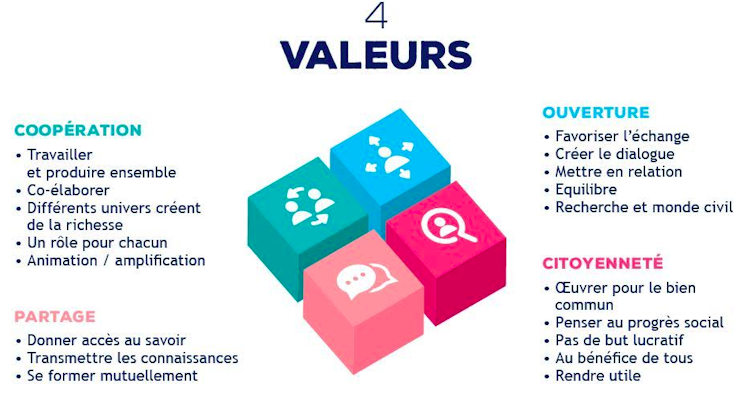 Comment induire une coopération entre des parties prenantes qui ont des fonctionnements, des cultures et des attentes très différents ? C’est toute l’originalité du travail d’accompagnement proposé par les équipes des boutiques des sciences. Nous prenons ci-dessous plus spécifiquement le cas de la boutique des sciences Lille Nord de France où les projets se formalisent par des stages d’étudiant en master 2 avec un double tutorat associatif/chercheur d’une durée de six mois. La coopération repose sur l’engagement à respecter les objectifs des différentes parties prenantes :