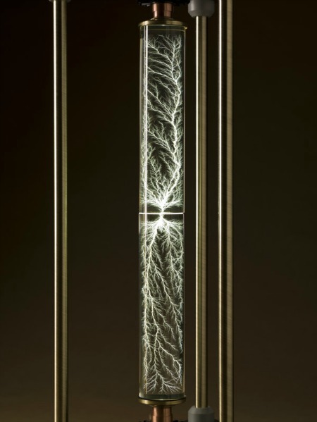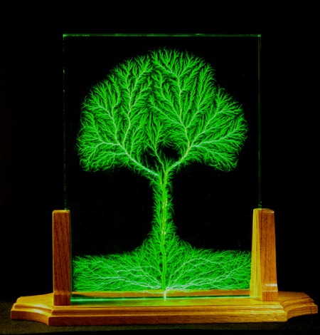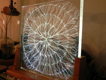 Lorsque la charge quitte le plexiglas, ils se regroupent et suivent un itinéraire ressemblant aux ramifications fractales. Le contrôle de l’énergie et du placement du faisceau d’électrons détermine la forme finale de l’ensemble, décrivant des figures de Lichtenberg.