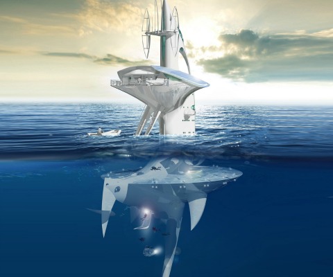 Imaginez. 58 mètres de hauteur et 2600 tonnes pour cette maison sous-marine autonome aux allures de vaisseau futuriste. Car une des particularités du SeaOrbiter est qu’il possède une partie émergée et une partie immergée, le tout divisé en 10 niveaux dont 4 au dessus du niveau de la mer. C’est donc plus de la moitié du bâtiment marin qui évolue sous l’eau. Des engins d’exploration subaquatiques pourront ainsi sortir et rentrer du SeaOrbiter directement dans la mer.
