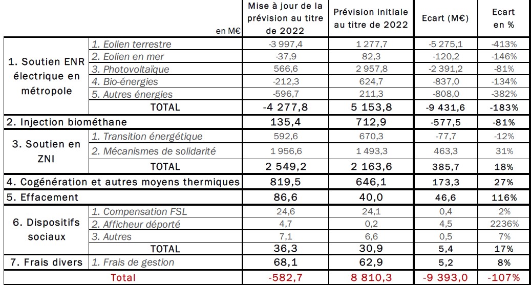 En conséquence, les entreprises exploitant des installations renouvelables vont devoir rembourser le trop-perçu. Les montants sont faramineux. Pour 2021, alors que la CRE avait fait une précédente estimation des CSPE à 7,9 milliards d’euros, la hausse des prix de gros de l’électricité au 2e semestre 2021 les a fait baisser à 6,1 Md€. Une première économie de 1,8 Md€ non négligeable, même si les CSPE restent à ce stade une charge pour les contribuables. 2022 voit s’amorcer le changement : la prévision qui s’établissait à 8,8 Md€ pour cette année a été réévaluée à -582 millions d’euros. C’est un gain net pour les finances publiques, certes modeste mais rendu possible par une contribution de l’éolien (-4 Md€), des bioénergies et des autres énergies (-0,8 Md€) tandis que les autres restent des coûts pour la collectivité (voir tableau).