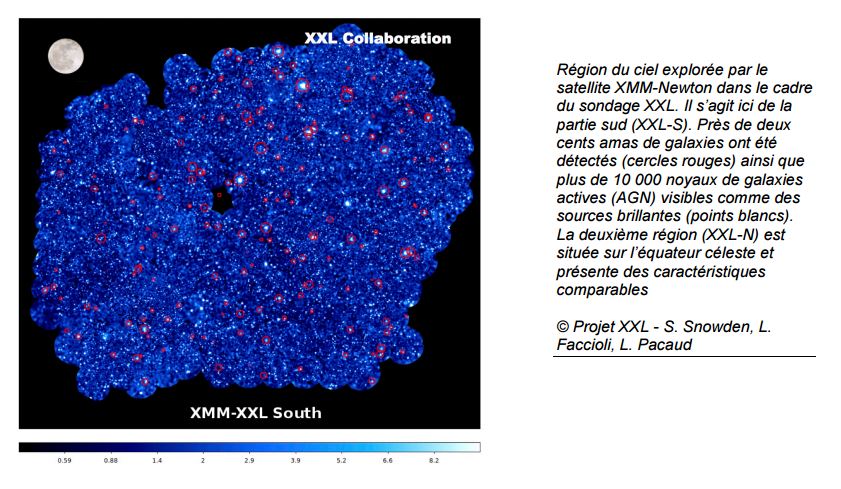 Ce sondage, baptisé XXL, et réalisé grâce notamment au satellite XMM-Newton de l’ESA et aux télescopes de l’ESO, a permis de localiser et d’identifier 450 amas de galaxies, ainsi que 22 000 galaxies actives1 . Astronomy & Astrophysics publie une première série de résultats de la collaboration internationale, menée par le CEA, et qui compte des chercheurs et moyens du CNRS, du CNES, d’Aix Marseille Université, et de l’Observatoire de la Côted’Azur. Les amas de galaxies sont les plus grandes structures de l’Univers, pouvant atteindre des masses de plus de cent mille milliards de fois celle du Soleil. Le sondage XXL, réalisé de 2011 à 2013 à l’issue d’observations2 en rayons X du satellite XMM-Newton, a pour but de constituer un catalogue de plusieurs centaines d’amas de galaxies, situées jusqu’à des distances si lointaines qu’on les observe telles qu’elles étaient lorsque l’Univers avait la moitié de son âge actuel. Les chercheurs pourront ainsi reconstituer l’évolution et la répartition spatiale de ces structures, et tester différents scénarios cosmologiques.