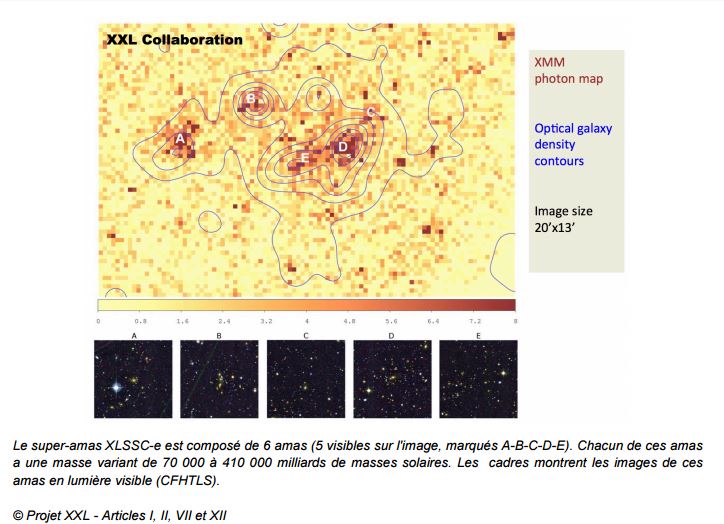 Les résultats présentés dans cette première série d’articles portent sur les 100 amas de galaxies les plus brillants détectés par le sondage XXL. Ils permettent une première reconstruction de la structure de l’Univers jusqu’à des distances de plus de 11 milliards d’années-lumière3 . Ils révèlent une densité d’amas sensiblement moins élevée que celle prévue par les modèles cosmologiques, ainsi qu’une quantité de gaz dans ces amas également plus faible qu’attendue. Un déficit similaire avait été observé pour les amas plus massifs directement détectés par le satellite Planck sur tout le ciel. Cela suggère, soit que certains paramètres décrivant la physique des amas doivent être revus, soit que le modèle cosmologique est plus complexe – ou différent – de ce qui est envisagé actuellement. L’étude de l’échantillon complet des 450 amas du projet XXL, qui sera publiée d’ici deux ans, devrait permettre de préciser cette conclusion. Les premières analyses d’XXL révèlent aussi la découverte de cinq nouveaux « superamas » ou « amas d’amas » de galaxies : par exemple, le super-amas XLSSC-e, dans la constellation de la Baleine, à une distance d’environ 4,5 milliards d’années-lumière, est constitué de six amas différents couvrant une région du ciel de 0,3 degré par 0,2 degré, ce qui, à cette distance, correspond à des dimensions de 7 x 4,5 millions d’années-lumière.