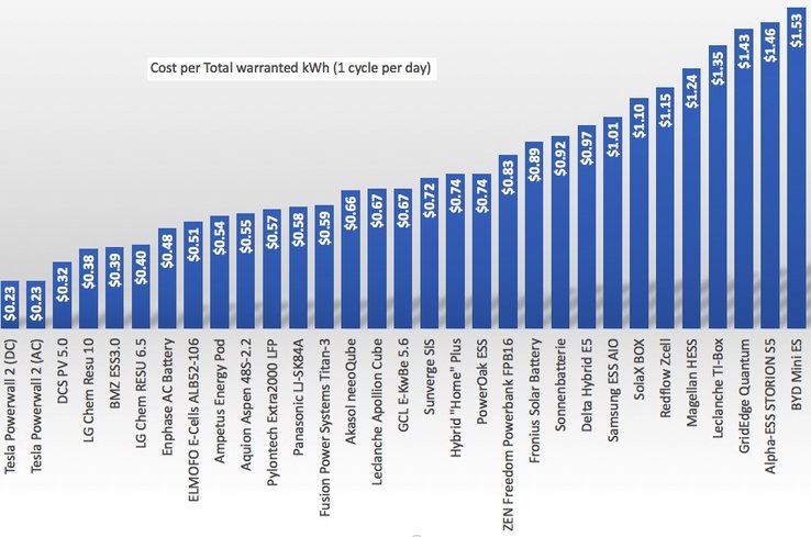 Le média spécialisé australien RenewEconomy (« Graph of the day« ) a récemment effectué un comparatif du coût du kWh de stockage des différentes batteries. Le résultat est sans appel, le Tesla Powerwall (version 1 et 2) pulvérise la concurrence. Et en outre intègre un onduleur. Sur le marché australien le solaire en bouteille serait dès à présent meilleur marché que l’électricité provenant du réseau, selon RenewEconomy.
