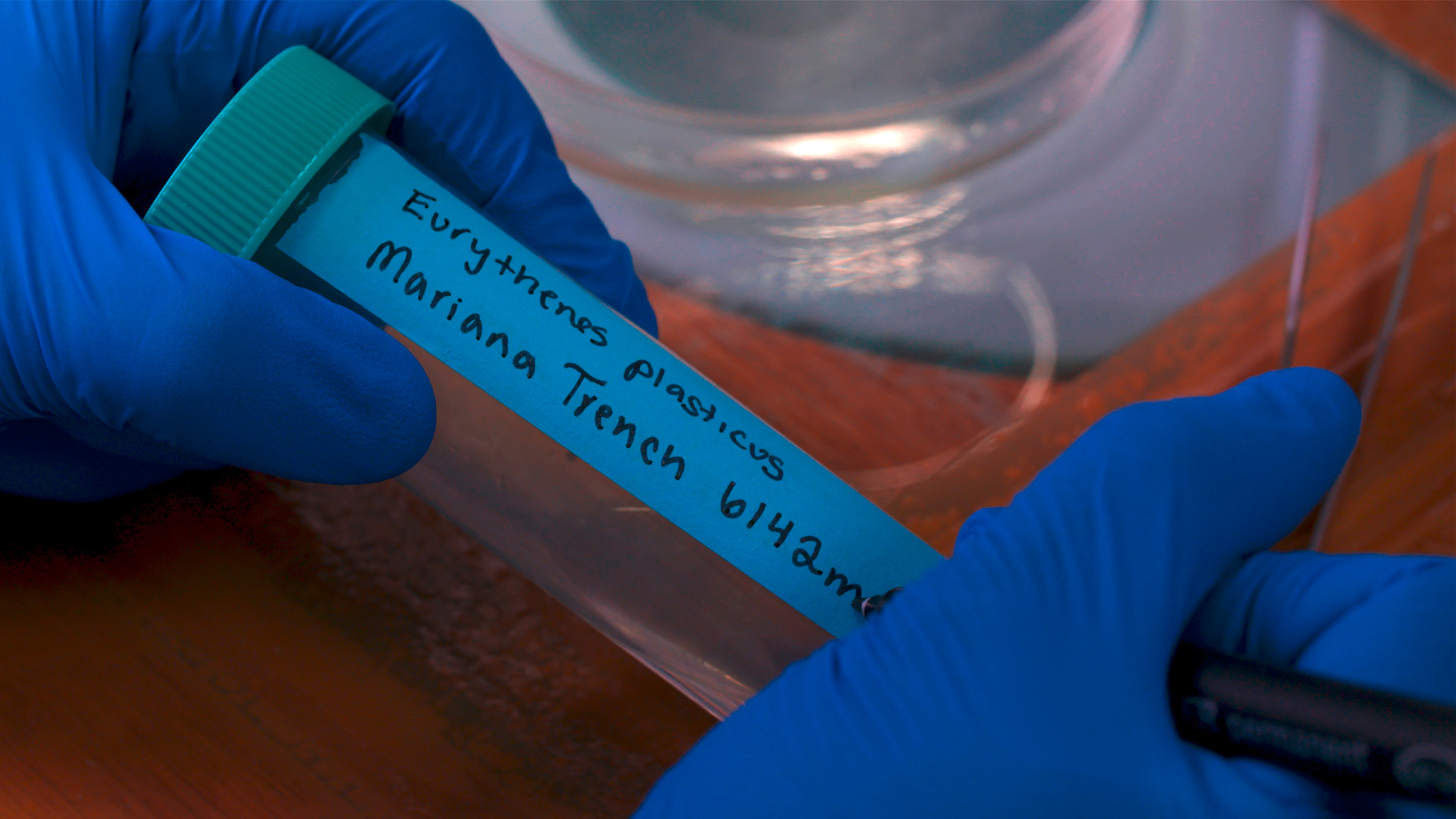 Cette nouvelle espèce d’amphipode a été prélevée entre 6 010 et 6 949 m de profondeur. Les chercheurs ont fait une analyse de microplastiques dans quatre juvéniles (crustacés lorsqu’ils sortent de l’œuf) d’Eurythenes Plasticus. Les trois individus prélevés à 6 865 m étaient exempts de fibres plastiques. En revanche, le juvénile d’une longueur corporelle de 15,6 mm et prélevé à 6 949 m, contenait une fibre sombre de 649,648 μm de long dans son intestin postérieur. L’analyse par spectroscopie infrarouge à transformée de Fourier a déterminé que cette fibre était similaire à 83,74 % au polyéthylène téréphtalate (PET). Ce polymère sert à fabriquer divers emballages et objets du quotidien en plastique, en particulier les bouteilles d’eau et de sodas, ainsi que les vêtements synthétiques en polyester.