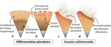 Les étapes de la différenciation planétaire (ségrégation du noyau, cristallisation de l’océan magmatique et formation de croûte par fusion partielle), suivies de l’érosion par les impacts, ont fait évoluer la composition chimique de la planète.