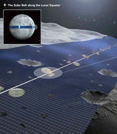 « Luna Ring », c’est le nom de ce projet pour le moins original : une entreprise japonaise (Shimizu Corporation) a pour objectif de récupérer l’énergie du soleil en installant des panneaux solaires tout autour de la lune.