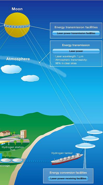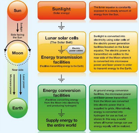 Un réseau de cellules solaires mesurant jusqu’à 40 kms entourerait l’équateur lunaire. L’énergie produite à partir de ces cellules serait transférée aux stations terrestres de réception grâce à des antennes de 20 kms de diamètre. Cette transmission serait assurée par une balise de guidage.