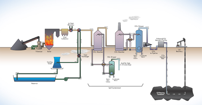 En 2014, un groupe générateur vieillissant au sein de la centrale électrique de Boundary Dam, près de la ville canadienne d’Estevan, aura été transformé en une centrale au charbon propre et fiable d’une puissance de 110 MW. Ce projet pilote prévoit en effet le captage et le stockage intégrés du carbone, réduisant ainsi les émissions de gaz à effet de serre d’environ un million de tonnes par an, soit l’équivalent du retrait de la circulation de plus de 250 000 véhicules dans la province de la Saskatchewan chaque année. Le dioxyde de carbone (CO2) capté sera utilisé pour la récupération assistée d’hydrocarbures et le dioxyde de soufre (SO2) récupéré servira à la production d’acide sulfurique.