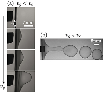 (a) Evolution typique de la cavité créée dans un film lorsque la vitesse du gaz Vg croit et est inférieure à la valeur minimale de création de bulles Vc. (b) Des bulles se forment lorsque Vg est plus grande que Vc.