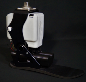 Notre dispositif est le fruit d’un assemblage de quatre briques technologiques. La première est constituée d’un moteur électrique, relié à une transmission mécanique, dont la fonction est de remplacer le mollet. La seconde se présente sous la forme d’un ressort qui vient se substituer au tendon d’Achille. La troisième repose sur une carte électronique qui pilote le système et fait office de contrôle moteur en remplacement du cerveau. Et la dernière se présente sous la forme d’une batterie dont le rôle est de remplacer la dépense métabolique d’un humain par une dépense électrique. L’ensemble de ces briques mécatroniques nous permet de créer un système analogue à celui d’une personne valide avec un mollet, un tendon d’Achille, une cheville, un pied ; le tout est animé d’un mouvement très naturel, calqué sur la démarche humaine.
