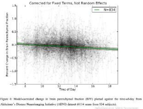 Les auteurs de l’étude y démontrent que le cerveau des patients est plus gros quand les scans sont effectués dans la matinée, par rapport à ceux de l’après-midi ou du soir pour ces mêmes patients.