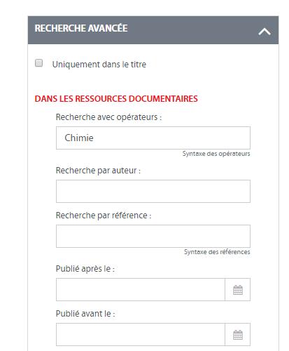 - Pour les ressources documentaires, il est possible de rechercher un document :