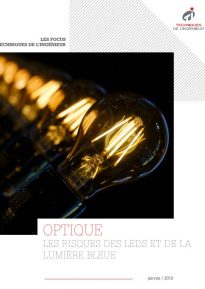 Des normes existent donc qui encadrent le risque photobiologique, notamment le risque rétinien en lumière bleue lié aux LEDs : les ampoules à LEDs, disponibles pour le grand public, appartiennent obligatoirement à un groupe de risque 0 ou 1(norme EN 62560). Quant à la norme EN 60598-1[18] qui définit les exigences de conception des appareils d’éclairage, elle précise qu’ « actuellement les seuls types de sources lumineuses pour lesquelles le risque lié à la lumière bleue doit être considéré sont: les types à LED, à iodures métalliques et quelques spécialités tungstène-halogènes ».