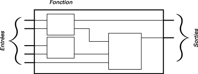 Le diagramme FBD décrit une fonction entre des variables d’entrée et des variables de sortie. Une fonction est décrite comme un réseau de fonctions élémentaires. Les variables d’entrée et de sortie sont connectées aux boîtes fonctions par des arcs de liaison. Une sortie d’une boîte peut être connectée sur une entrée d’une autre boîte.