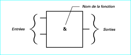 La fonction complète représentée par un programme FBD est construite à l’aide de boîtes fonctions élémentaires. Chaque boîte fonction élémentaire, représentée par un rectangle, a un nombre prédéfini de points de connexion en entrée (à gauche) et en sortie (à droite). Elle réalise une fonction élémentaire entre ses entrées et ses sorties, caractérisées par un type. Le nom de la fonction réalisée est inscrit dans le rectangle de la boîte.