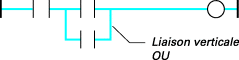 Une liaison multiple à gauche combine plusieurs liaisons horizontales connectées à gauche d’une liaison verticale, et une seule liaison horizontale à droite. L’état de l’extrémité à droite est le résultat du OU logique entre les états des extrémités à gauche.