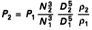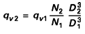 Les formules suivantes permettent de déduire, à partir de mesures faites sur un ventilateur de diamètre D 1 et tournant à une vitesse N1 , les performances aérauliques d’un ventilateur à une vitesse de rotation N2 et un diamètre D 2 . Cela suppose que le deuxième ventilateur soit homothétique du précédent et que le rapport D1/D2 reste modéré (de l’ordre de 2 à 3) pour éviter les effets d’échelle. La masse volumique de l’écoulement peut également différer entre les conditions 1 et 2.