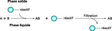 Lorsqu'un réactif est fixé à un polymère, le processus s'effectue généralement en une seule étape. Les réactifs en solution A et B réagissent avec l'entité supportée, qui peut être, par exemple, un catalyseur ou une enzyme (selon cf. § 6) :