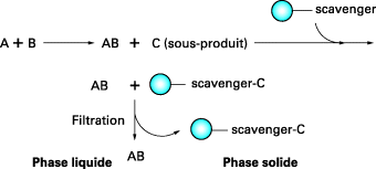 Lorsqu'un agent de piégeage supporté (scavenger § 6.5) est utilisé, les réactifs en excès ou les produits secondaires non désirés (notés C), présents dans le milieu réactionnel, sont fixés sur la phase solide et ensuite éliminés par simple filtration :