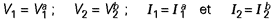 Le quadripôle résultant de l’association est tel que ses tensions et courants V1, V2, Ι1, Ι2 sont liés aux tensions et courants des quadripôles constituants par les relations :