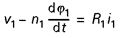 Deux bobines, comportant respectivement n1 et n2 spires, sont enroulées sur un circuit magnétique selon le principe de la figure 15. L’application d’une tension v1 aux bornes de la première bobine, appelée conventionnellement enroulement primaire, engendre un courant i1 qui donne naissance à un flux dont nous noterons ϕ1 la valeur moyenne par spire dans l’enroulement primaire. La variation de ϕ1 engendre à son tour une force électromotrice n1 dϕ1 / dt qui vient s’opposer à la cause qui lui a donné naissance. Si nous appelons R1 la résistance de l’enroulement, nous pouvons écrire :