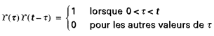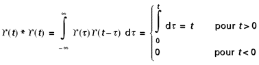 ϒ (t) * ϒ (t) = tϒ (t)En effet, ϒ (τ) est nul pour τ < 0 et ϒ (t − τ) est nul pour t − τ < 0, c’est-à-dire pour τ > t. Par conséquent :