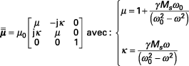 appliqué au ferrite est suffisamment fort pour vaincre toutes les contraintes internes, la structure en domaines disparaît et les moments magnétiques sont tous alignés. Dans ce cas, le tenseur perméabilité se déduit de l'équation d'évolution avec