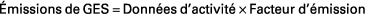 Les émissions de gaz à effet de serre, dont les résultats peuvent être exprimés en tonnes équivalent carbone ou en tonnes équivalent CO2, sont calculés selon la formule suivante au moyen des tableurs de l'outil, pour chaque poste d'émission pris en compte :