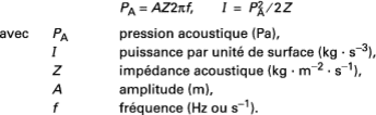 L’onde se propage en milieu solide, liquide ou gazeux avec une célérité c, qui dépend des propriétés physiques du milieu, et une longueur d’onde λ (λ = c/f). En milieu liquide, on suppose que l’onde est plane et longitudinale. La pression acoustique P A ou surpression par rapport à la pression d’équilibre et l’intensité transportée par l’onde I (puissance par unité de surface) peuvent s’écrire en fonction des caractéristiques de la source et du milieu :