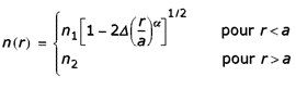 Dans une fibre à gradient, l’indice de réfraction en fonction du rayon r est donné par l’expression suivante :
