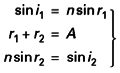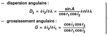 Un faisceau parallèle de rayons monochromatiques est incident sur la face d’entrée avec l’angle i 1 , est réfracté dans le verre (d’indice n ) avec l’angle r 1 , puis tombe sur la face de sortie avec l’angle d’incidence r 2 pour émerger avec l’angle i 2 . Tous ces angles sont les angles des rayons avec la normale aux faces du prisme (figure 10). Si l’angle du prisme est A (en général A = 60o), les angles i 2 et i 1 sont liés par l’ensemble des relations de Descartes et des relations géométriques suivantes :