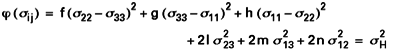 Le critère de plasticité d’un matériau est une relation de la forme ϕ (σ ij) = C où ϕ est une fonction des composantes σ ij du tenseur des contraintes et C une constante du matériau. Lorsque le chargement imposé est tel que ϕ (σ ij) < C, le matériau ne se déforme pas ; lorsque le critère est vérifié, il y a déformation plastique ; enfin, la situation où ϕ (σ ij) > C n’a pas de sens dans cette théorie : au cours de la déformation plastique, la fonction ϕ évolue en effet (écrouissage) de façon telle que, soit le matériau est déchargé [ϕ (σ ij) < C], soit le critère continue d’être vérifié. Pour illustrer cette notion, on prendra pour exemple le critère quadratique de Hill [5], qui décrit le comportement plastique d’un matériau incompressible orthotrope :