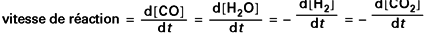 La vitesse de réaction s’exprime par la variation de concentration molaire d’oxyde de carbone par unité de temps. Remarquons qu’elle est égale, au signe près, à la variation de concentration molaire de chacun des quatre constituants intervenant dans la réaction :