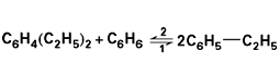 Il faut lui adjoindre les réactions ultérieures de l’éthylbenzène avec l’éthylène qui conduisent à la formation des différents isomères polyalkylés. Ces polyéthylbenzènes, eux-mêmes mis en présence de benzène dans le même milieu catalytique, sont transformés en composés inférieurs. Exemple :