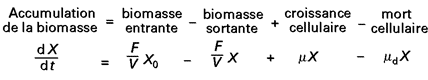 Dans un chemostat, l’équation du bilan de biomasse s’écrit, avec les conventions précédentes :