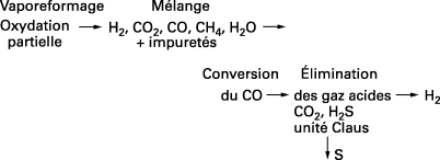 Certaines productions industrielles utilisent directement ce mélange gazeux (synthèses de l’ammoniac, du méthanol, etc.). L’hydrogène pur nécessaire à d’autres emplois met en œuvre une chaîne de production relativement complexe qui peut être schématisée ainsi :