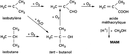 L’oxydation de l’isobutane, quoique attractive du fait du faible coût en matières premières, présente de nombreuses étapes réactionnelles, avec un rendement global actuellement encore trop faible et un procédé non encore maîtrisé :