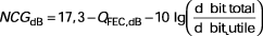 La performance d'un FEC est donnée par son gain de codage net (NCG pour Net Coding Gain ). Ce gain de codage varie en fonction du BER visé après correction et il est d'usage, dans les liaisons sous-marines, de le définir pour un BER de 10–13 (soit Q de 17,3 dB) après correction. Le NCG d'un FEC est donné par la formule suivante :