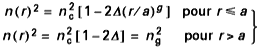 Lorsque n (r ) est constant dans le cœur, on parle de fibre à saut d’indice. Ce profil idéal simplifie les calculs, mais n’a aucune vertu particulière pour les applications pratiques. C’est un cas limite d’une famille de profils qui a été abondamment étudiée. L’expression générale de l’indice en fonction du rayon est donnée par la relation suivante :