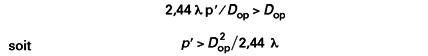 Avant de considérer les faisceaux gaussiens, il est utile de se pencher plus avant sur les implications de la formule 1 / p ’ – 1 / p = 1 / f ’ lorsque l’on prend en compte la diffraction. Supposons que l’on cherche à former l’image d’un point source situé très près du foyer objet d’une lentille. Dans le cadre de l’optique géométrique, le diamètre minimal du faisceau de sortie, qui se trouve dans le plan image, est nul. Ce n’est plus vrai si l’on tient compte de la diffraction car, si l’objet est exactement au foyer, l’image est rejetée à l’infini, et le diamètre de son disque d’Airy est lui‐même infini. Le diamètre minimal du faisceau ne peut pas être dans le plan image si le diamètre du disque d’Airy est supérieur à celui de la lentille, c’est‐à‐dire si :