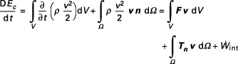 Pour traduire ce théorème, on utilise l’équation de bilan d’une grandeur scalaire [équation [1]]. Ici, la grandeur scalaire G est l’énergie cinétique Ec du fluide contenu à l’instant t dans le volume V et la grandeur volumique g, l’énergie cinétique par unité de volume ρv2/2. Alors, en notant par Ω la surface frontière avec le milieu extérieur, on a :