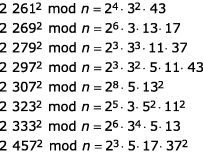 modulo n soit friable, c'est-à-dire se décompose en petits facteurs premiers. Si on se limite aux facteurs premiers inférieurs à 50, on trouve par exemple les huit relations suivantes (modulo n = 5 105 929) :