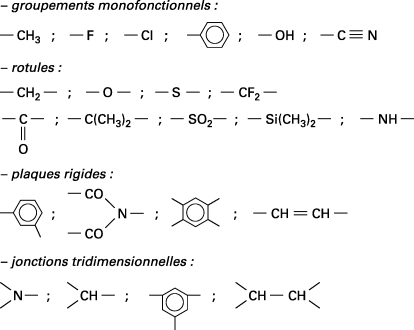 Notons que les polymères industriels sont réalisés à partir d’un nombre relativement restreint de groupements élémentaires, par exemple :