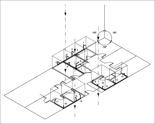 Les éléments principaux du réseau (canalisations horizontales, chutes, etc.,) sont repérés sur la projection orthogonale, plan d’architecte, où sont déjà localisés les appareils sanitaires. Cette représentation fait apparaître clairement que les réseaux sont groupés autour des chutes ( cf . Fig. 1 ).Schémas isométriques