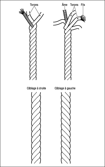 Généralement constitué de 3 ou 4 torons câblés ensemble (sans âme pour le cordage à trois torons, le plus souvent avec pour le cordage à 4 torons). Suivant le sens du câblage, on écrira « Z » pour un câblage à droite et « S » pour un câblage à gauche ( cf. Fig. 1 ).Cordage tressé