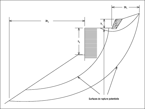 Dans le cadre de versants de géométrie importante, en montagne en particulier, on limitera les justifications à une zone bornée à l’amont et à l’aval par une distance à partir du plan de soutènement égale à trois fois la hauteur du mur ( cf . Fig. 1 ). Le principe qui prévaut consiste à augmenter la stabilité dans l’environnement proche de l’ouvrage sans être obligé de conforter toute la montagne.