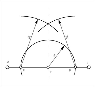 Avec un compas, prendre un rayon R 1 < AP et < PB. Tracer à partir du point P un arc de cercle de rayon R 1 qui coupe AB en C et D. Le point P se trouve alors au milieu de CD. Les arcs de cercle tracés avec un rayon R 2 > CD/2, du point C puis du point D se coupent sur la perpendiculaire à AB passant par le point P ( cf . Fig. 2 ).