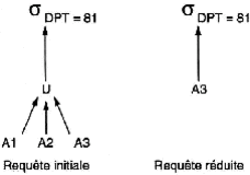 On réduit la requête en déterminant les relations intermédiaires de l’arbre algébrique de la requête qui seraient vides. Pour cela, on utilise des règles du type :—[nbsp ]soit R1,…, Rn les fragments avec Ri = σPi (R)alors